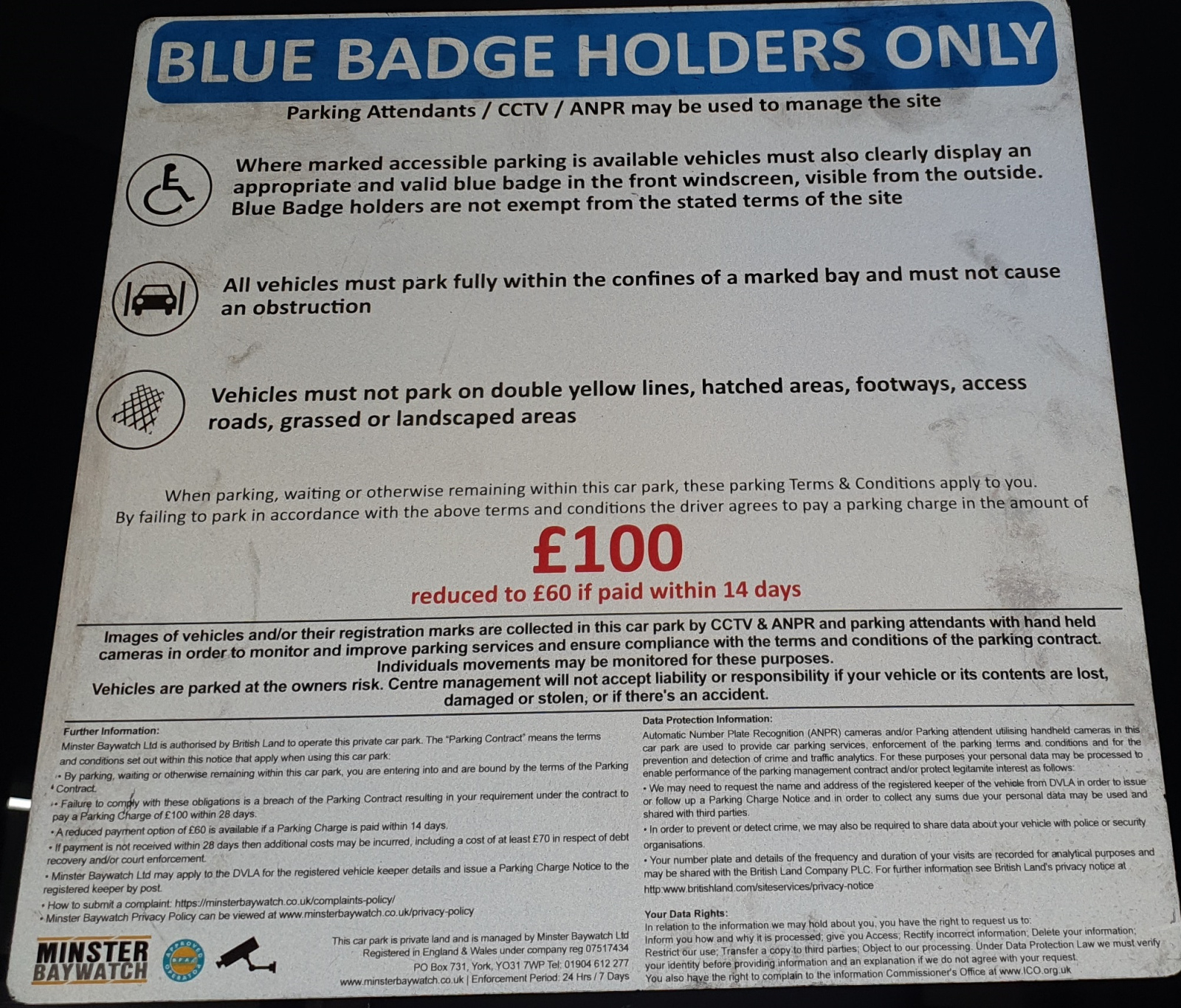 - a view taken from the disabled bays, showing a lack of t&cs readable from the car seat.