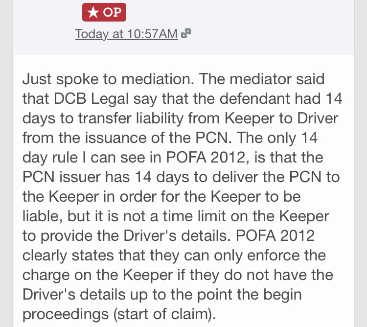 Just spoke to mediation. The mediator said that DCB Legal say that the defendant had 14 days to transfer liability from Keeper to Driver from the issuance of the PCN. The only 14 day rule I can see in POFA 2012, is that the PCN issuer has 14 days to deliver the PCN to the Keeper in order for the Keeper to be liable, but it is not a time limit on the Keeper to provide the Driver's details. POFA 2012 clearly states that they can only enforce the charge on the Keeper if they do not have the Driver's details up to the point the begin proceedings (start of claim).