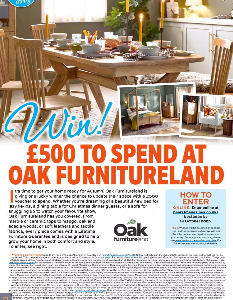 The prize is £500 to spend at Oak Furnitureland. Lifetime Furniture Guarantee covers the structural framework of all of Oak Furnitureland furniture, giving you confidence they’re built to last.