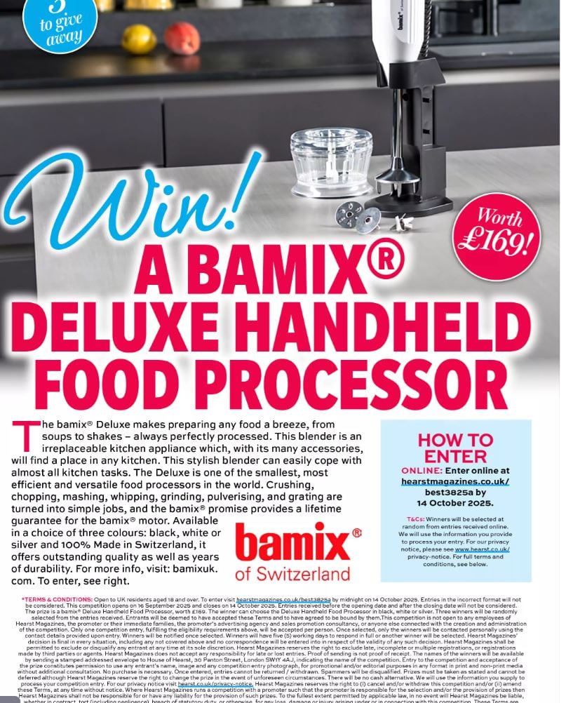 The prize is a bamix® Deluxe Handheld Food Processor, worth £169. The winner can choose the Deluxe Handheld Food Processor in black, white or silver. Three winners will be randomly selected from the entries received