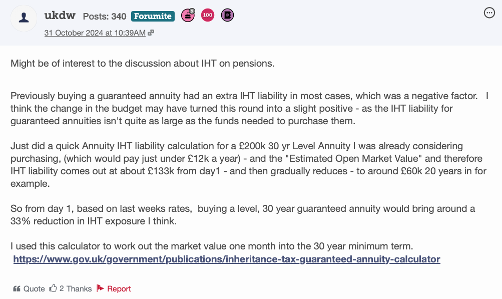 SmokeysTravels said:Sorry, I should have been clearer! I meant how ongoing guaranteed period and value protection are going to be treated for IHT purposes has not yet been finalised. Personally, I believe that this would be incredibly harsh as when you buy a lifetime pension annuity you can’t change it. So these people who already have them, and potentially will find that these payments might now have IHT liabilities (as well as income tax) can’t do anything about it, whereas those with a SIPP still has flexibility to potentially avoid it.1