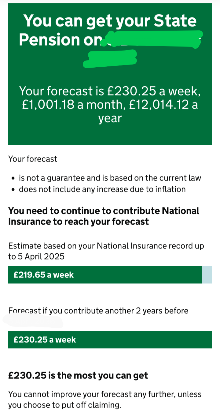 Noopin said:How do/did people know how many years to complete if it could be anywhere in a wide range?To build on jem16's comment, if you've not yet reached State Pension age you can go to:... and it will give you a snapshot of your state pension status. I don't think the page will work for you, though, as you're already receiving your pension.The page includes how much State pension you're already entitled to, how much extra you can accrue, and how many more years you need to add to get there.It will also indicate whether you have recently missed years that you can buy.Mine looks something like this:Different people will get slightly different versions of that page, depending on their situation.There's also a link from that page to one where you can view a summary of your NI history.N. Hampshire, he/him. Octopus Intelligent Go elec & Tracker gas / Vodafone BB / iD mobile. Ripple Kirk Hill Coop member.Ofgem cap table, Ofgem cap explainer. Economy 7 cap explainer. Gas vs E7 vs peak elec heating costs, Best kettle!