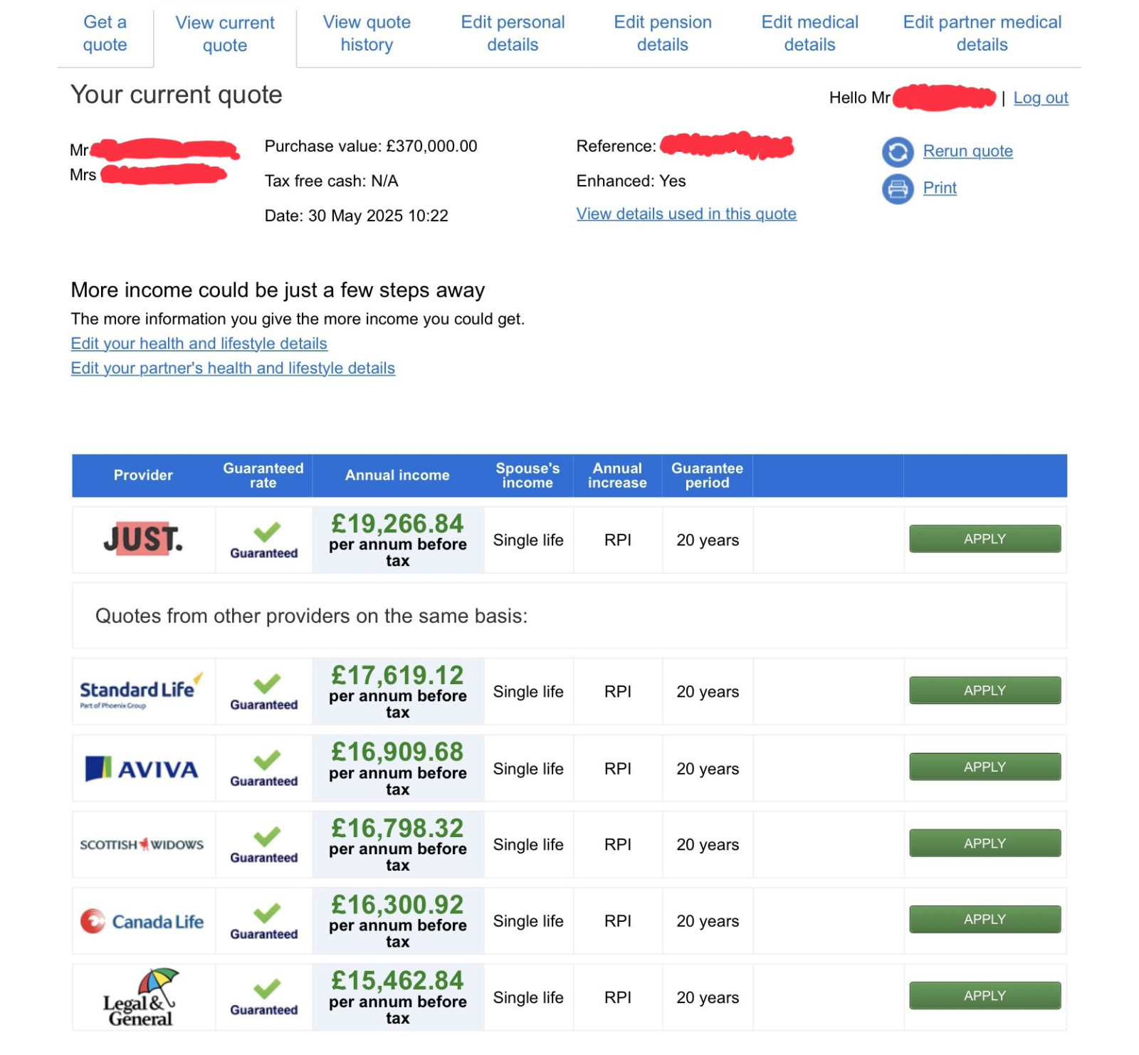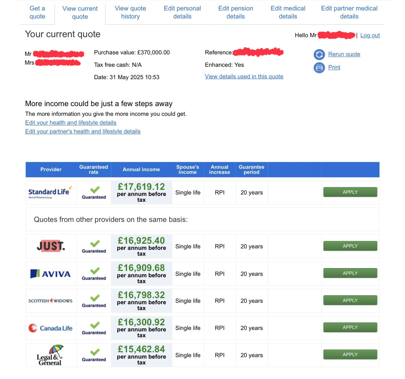 It can all be down to timing and demand. Somtimes, when a provider shoves its base annuity rate higher, it will lower the uplift for medical conditions. Other times it will lower its base annuity rate but increase the uplift. Sometimes, they will increase the base annuity rate but still leave medical uplifts applying to a lower base rate where you get the higher of the uplifted rate or the upper annuity rate.The day after I ran the Just quote on 30 May, their rates dropped by 12% the next day with Standard Life being the best quote by 5% (but still 10% less than the previous day’s quote by Just).May 2025 was a bit of a !!!!!! with Just. Although it wasn't their fault, it was the markets. Gilt yields were volatile, and Just's daily pricing and real-time pricing reflected the volatility. The others were smoothing it out but Just were following the volatility. If you got your timing right, you did very well out of it.