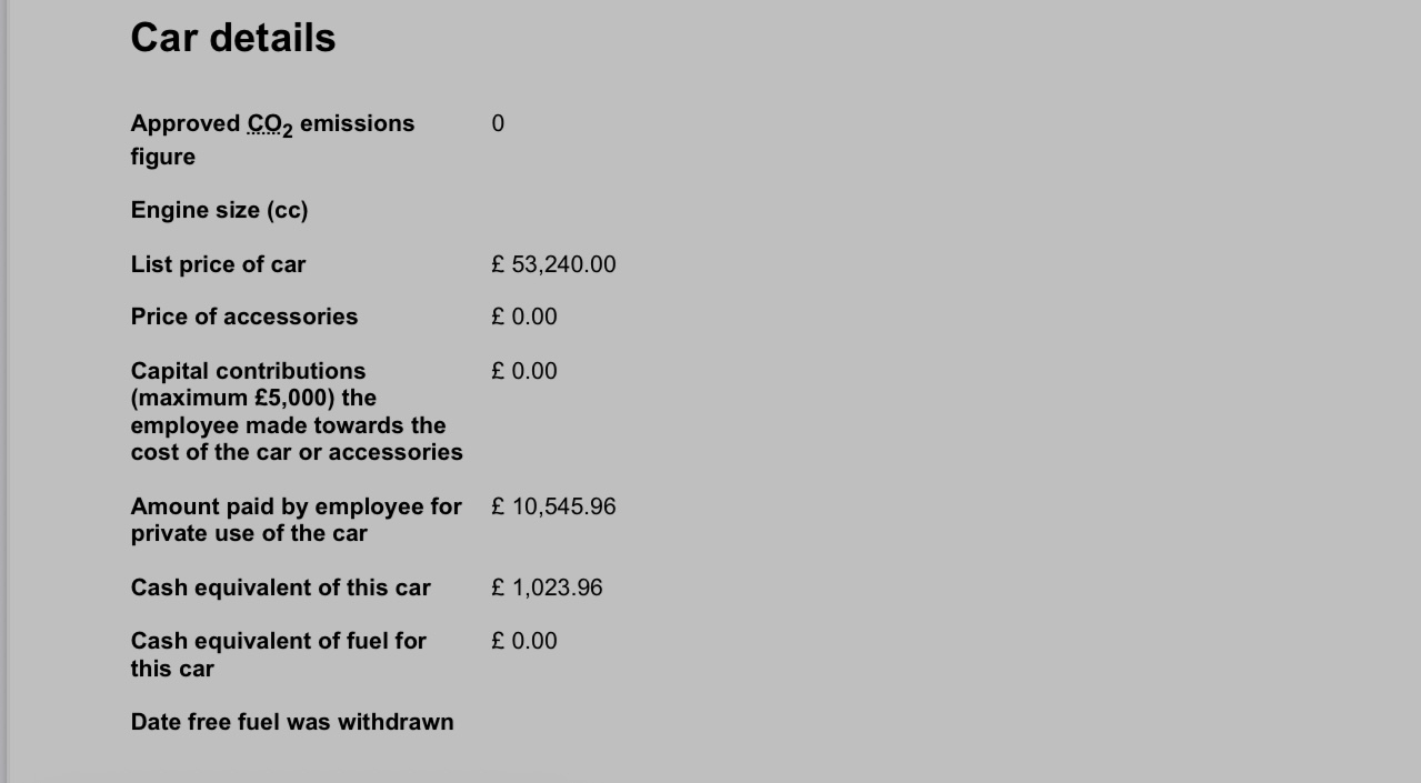 Car on salary sacrifice scheme is £850 a month. On the P11D is says 'amount paid by employee for use of car' - £10,500.