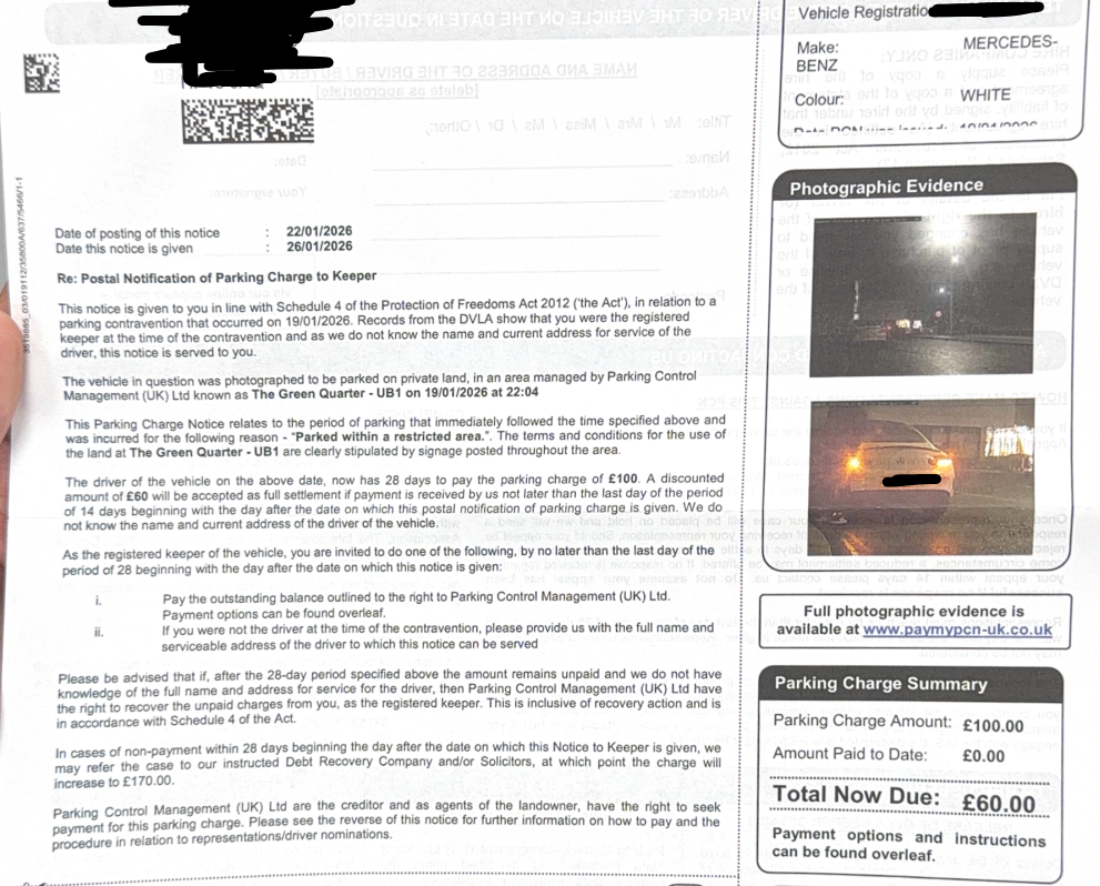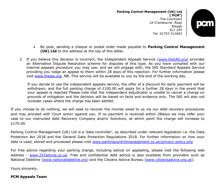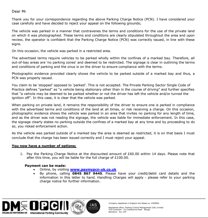 I am seeking advice regarding a rejected appeal from PCM UK Ltd for a PCN issued on 19/01/2026 at 22:04. My initial appeal was based on three main points: first, that I was momentarily 'boarding' passengers rather than 'parking,' which I argued is a standard road usage expectation. Second, I argued that since the evidence only showed a single timestamp, they failed to account for a mandatory grace period required by the IPC Code of Practice to read signage. Third, I challenged the visibility of the signage at night. As I was parked on a double yellow and that is also not private land, Idk why they are focusing on private land, it is litterlly outside Southall Station in London. Anyway, PCM has rejected this, strictly citing their code's definition of 'parked' as being 'stationary other than in the course of driving' and claiming that 'out-of-bay' areas are immediate no-parking zones with no grace period for reading signs allowed. *letter attached.