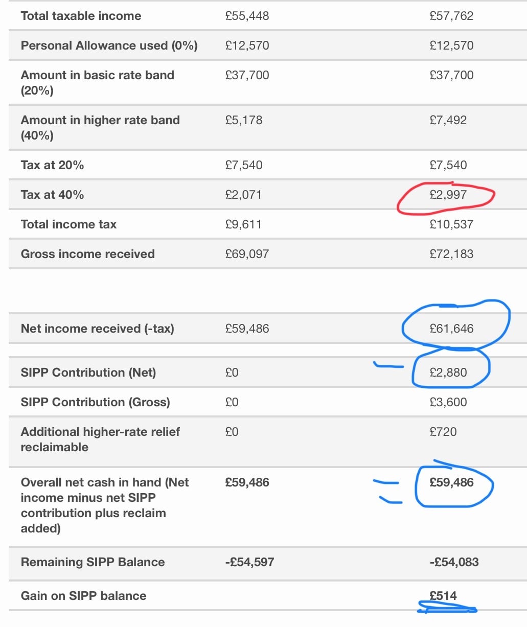 As you have correctly deduced from my ramblings I was trying to work out how much more I needed to take from the SIPP in order to recycle £2800 Net (£3600 Gross) back into the SIPP and still achieve the exact same cash in hand (after paying 40% tax and reclaiming higher rate tax relief on the £3600) and the answer left me with £514 more in the SIPP each year.