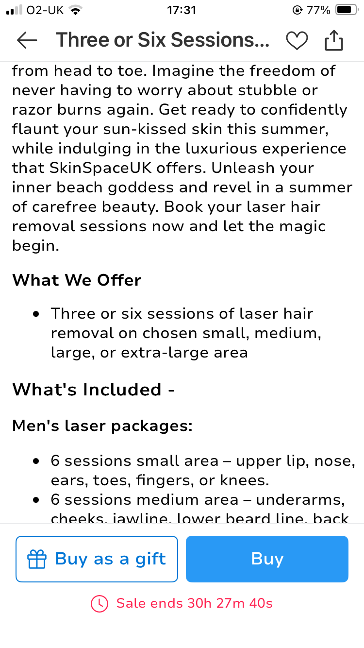 Sadly the devil is in the detail. Not scrolling to the important bit's in this case. Reviews might have pointed out the issue as well.unhappycustomer637 said:I recently brought a Groupon deal for a laser hair removal service from a company called Skinspace. When I called to redeem they advised certain body areas were excluded from their 'Full Body Package' and if I wanted these included it would cost around £400 more.When I challenged this the person advised that the Groupon Full Body Package was different to the package Skinspace offer direct from their website and this is stated in the terms and conditions. I didn’t see the terms of the deal and stupidly assumed by looking at skinspace website and seeing the price of the full body package on their site that this is what I was getting.I feel the terms were not easy to find on the Groupon App.HERE IS THE CONFUSION