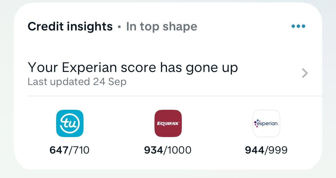 I've just realised the picture might not be showing. It's a screenshot of the Monzo app with my scores reading 647/710, 934/1000 and 944/999.0