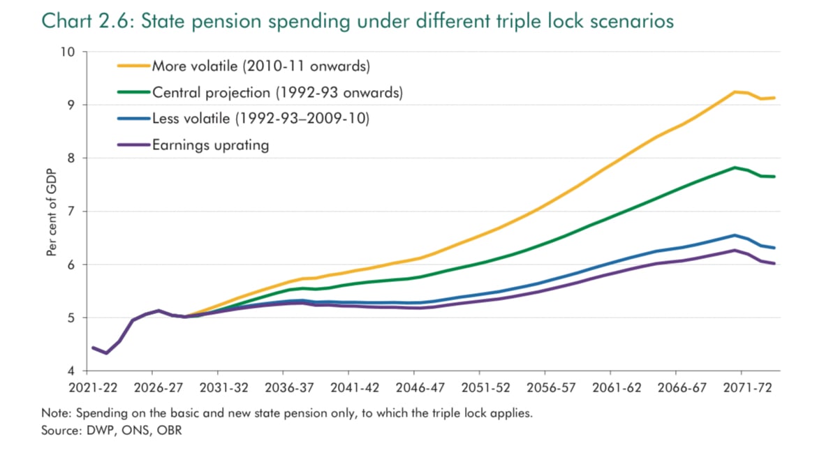michaels said:Presumably as the triple lock basically fixes the state pension relative to average income, the overall cost as a share of GDP will simply reflect demographics?Office for Budget Responsibility estimates the long-term annual cost of Triple Lock to be 4.41% p/a and earnings to increase by 3.83%.A 0.6 percentage point increase is not much in any single year, but compounds rapidly. In practice, the cost will not be in every year, but through unpredictable, bigger increases in certain years when inflation or 2.5% exceeds earnings growth.1