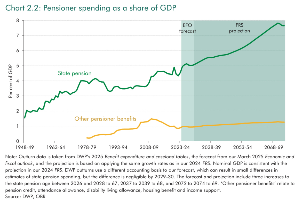 michaels said:Presumably as the triple lock basically fixes the state pension relative to average income, the overall cost as a share of GDP will simply reflect demographics?And any changes in state pension age.I'd expect to see a dip in that curve to reflect the increase in SPA to 68 in the mid-40s, for example.I'm also curious about the demographics assumed by the FRS for the second half of the century, since a lot of those people haven't been born yet.N. Hampshire, he/him. Octopus Intelligent Go elec & Tracker gas / Vodafone BB / iD mobile. Ripple Kirk Hill Coop member.Ofgem cap table, Ofgem cap explainer. Economy 7 cap explainer. Gas vs E7 vs peak elec heating costs, Best kettle!