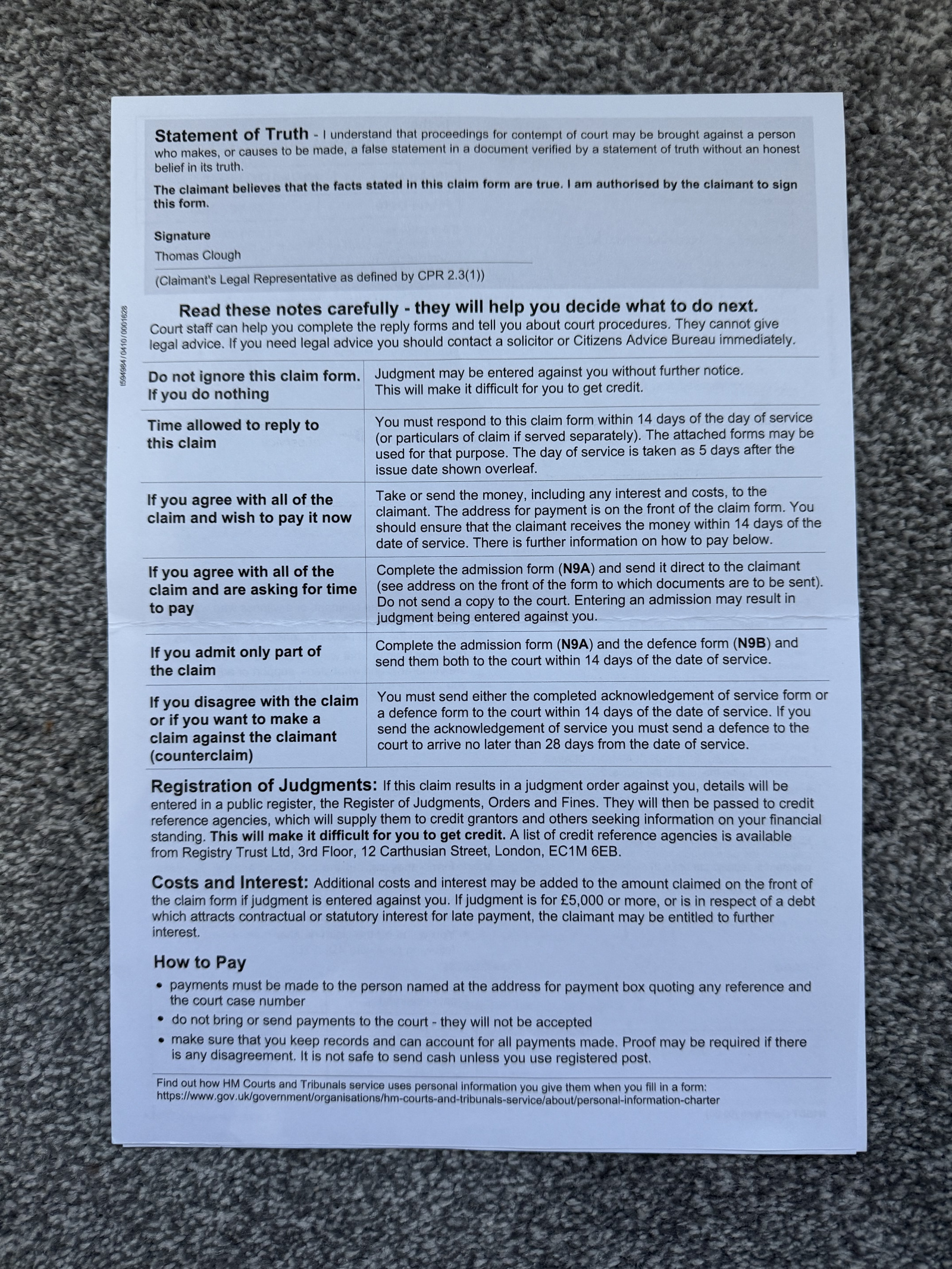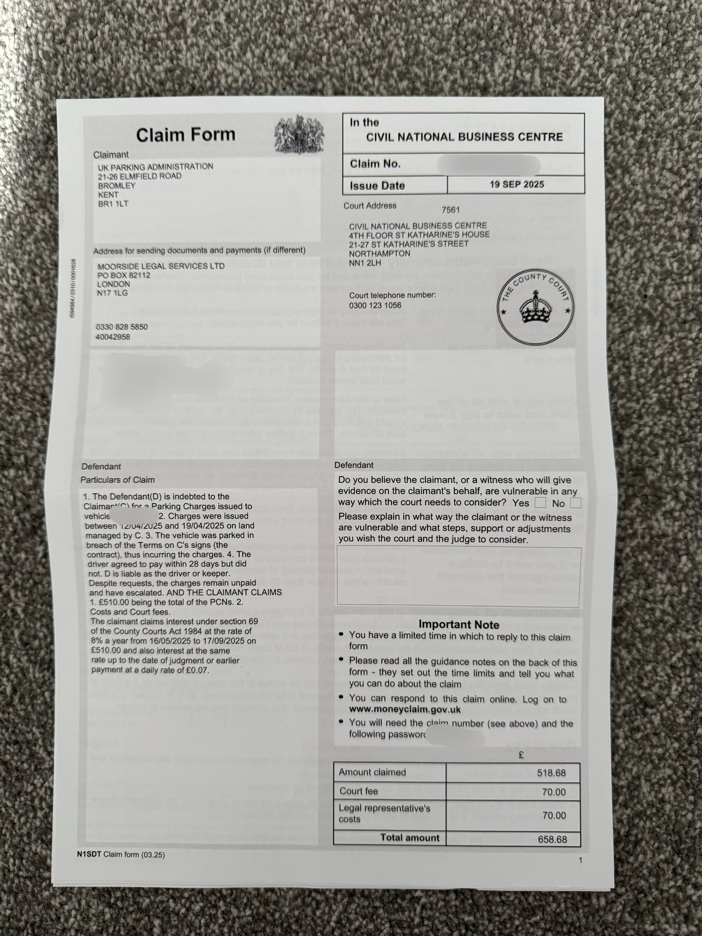 About a month later, I got a letter with a county court claim form. Date received was 23/09/2025.