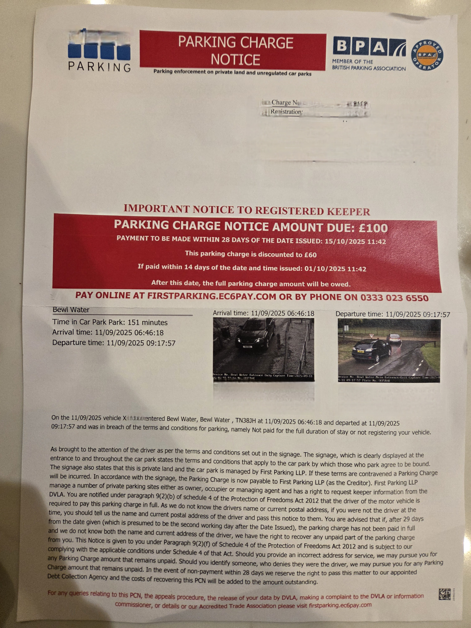 Registered keeper has now received a £100 PCN from First Parking LLP for Bewl Water.
