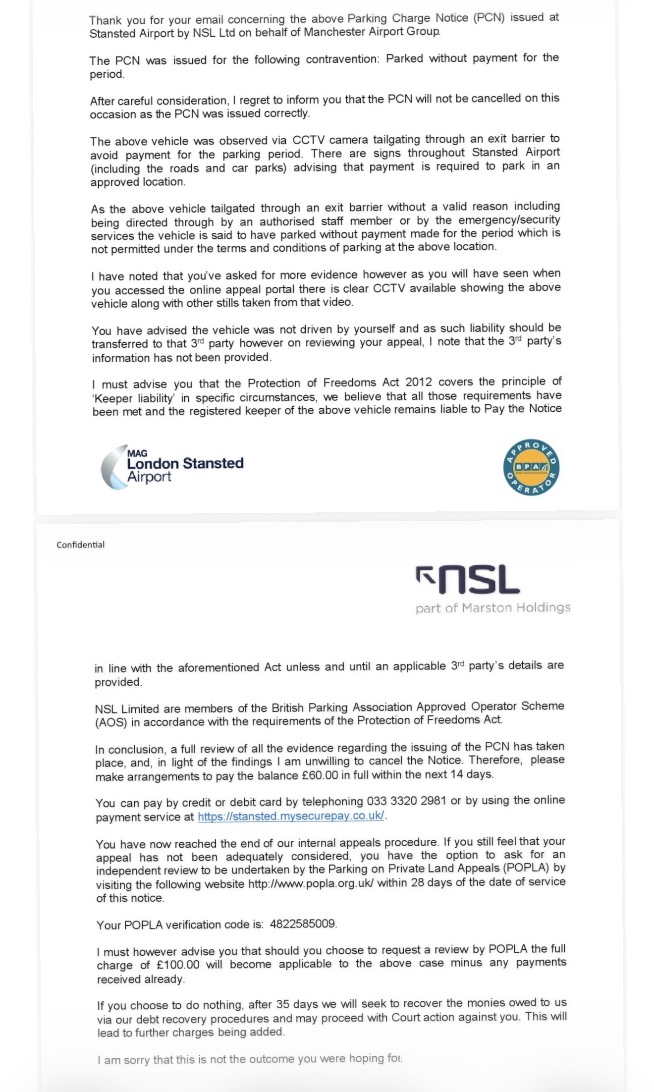 My son had my vehicle for an airport drop off. I recieved a PCN for that day stating he left without paying. I read the sticky thread on here and other threads and appealed to NSL stating I did not have provide the drivers name as I am only the registered keeper. I did not name who the driver was. Stated the usual reasons that it is not relevant land and the PCN isn’t POFA compliant. As suspected they’ve rejected it. I’ve attached an image of the rejection. Needed some help appealing. I wanted to know what’s the latest with the complaint against NSL for continuing to trying to get registered keepers liable for airports?