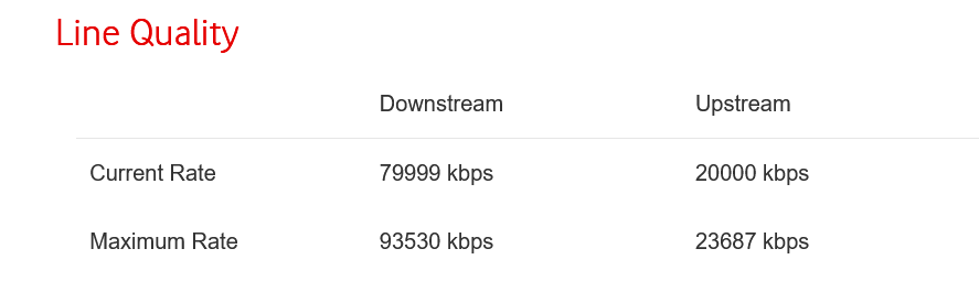 T.T.D said:I don’t have a PC as we’ve managed with phones and tablets.As above, you can't get a reliable speed test over wifi.T.T.D said:I questioned the router, being old, and I should have been sent a power box as the advert said it was included. Vodafone said all upgrades from existing customers keep their old boxes and don’t get new ones.I used to have a THG3000 (it's still here, now I think about it) and it had quite a useful diagnostics page. Does your router tell you what speed it has connected at?Edit: something like this; I'm only FTTC, so I'm obviously slower than you):Mark_d said:You says the 505MBps was via wifi? Have you tested with a wired ethernet connection?N. Hampshire, he/him. Octopus Intelligent Go elec & Tracker gas / Vodafone BB / iD mobile. Ripple Kirk Hill member.
