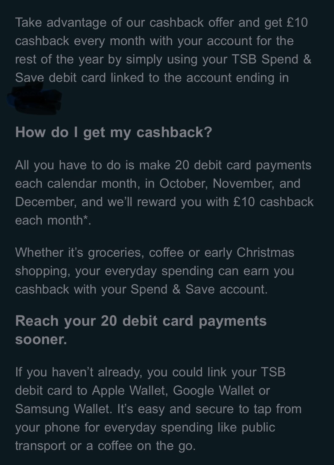 ‘4. Qualifying debit card payments are: online and mail order purchases, in-store purchases (including contactless, Apple Pay, Google Pay and Samsung Pay). ATM or other cash withdrawals using your card, Direct Debits, Standing Orders, bill payments made in a TSB branch and future dated payments are not qualifying payments.‘