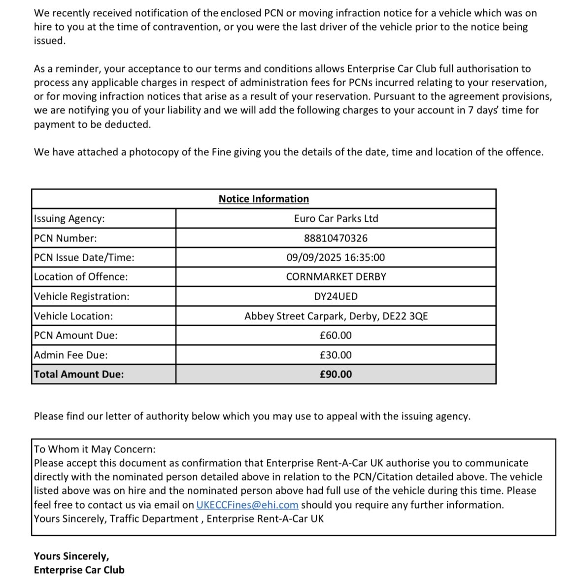 Hired a car with Enterprise car Club and sometime after received an email from them in regards to a parking notice from Euro car parks.