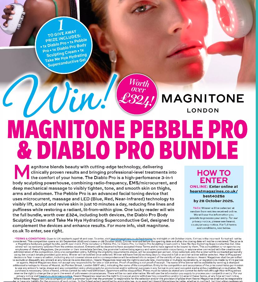 The prize is a Magnitone bodycare gadget bundle, worth over £324. Prize includes 1 x Pebble Pro, 1 x Diablo Pro, 1 x Diablo Pro Sculpting Cream and 1 x Take Me Hya Hydrating Superconductive Gel. One winner will be randomly selected from the entries received