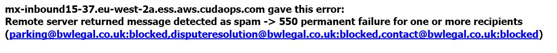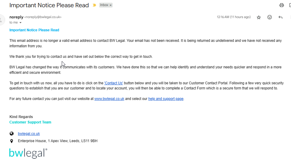 I am trying to send N180 form to BWLegal but have received an auto-response which is attached. Email address I have used is info@bwlegal.co.uk and customerinfo@bwlegal.co.uk.