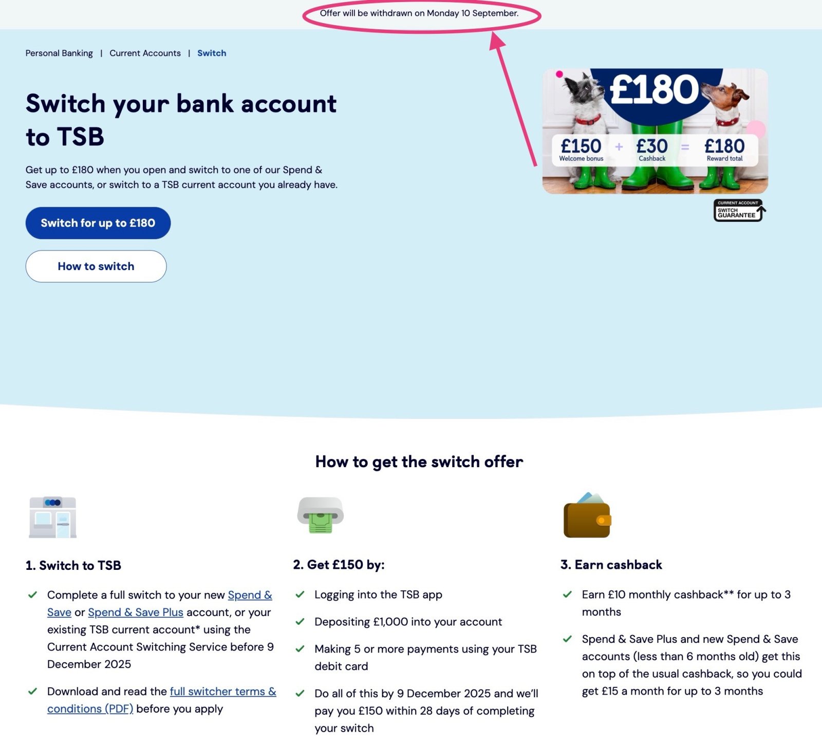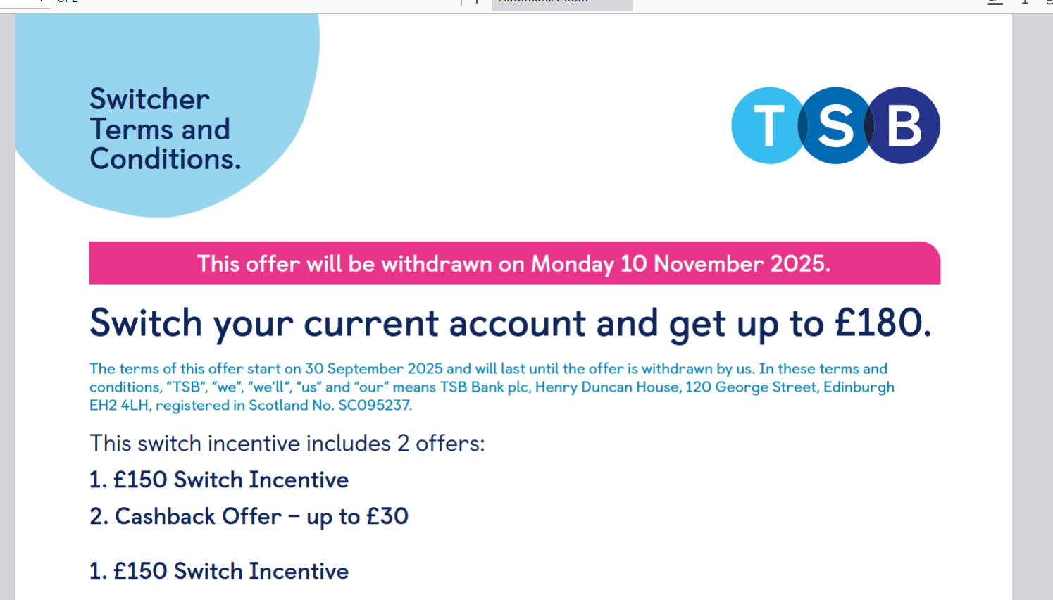 TSB £180 Switch and Stay offer (30/09/2025 to 10/11/2025)