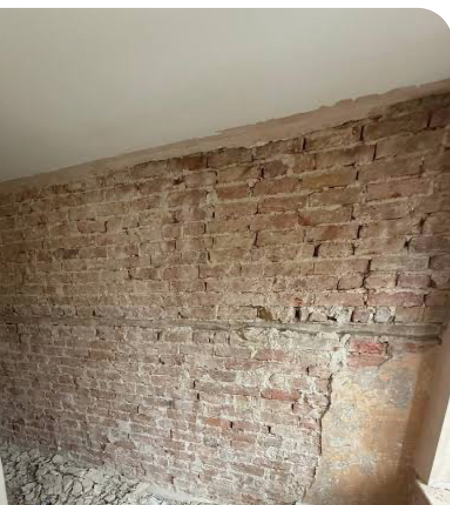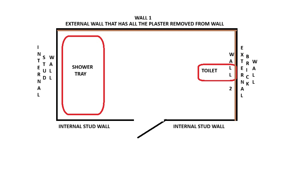 We are renovating a really small, old terraced house. We knew when we bought it that all the (plaster & lath) ceilings would have to come down and all the walls would have to be stripped of the loose plaster. So, over the last few weeks we have done exactly as that, and we now have every wall stripped of plaster and looking exactly like the one shown in the image. The next stop in the whole house is first fix electrics and plumbing, (which we will get professional tradesmen in to do), but we are stuck what to do on 2 of the walls that are stripped back to brick because we want to make a new en-suite bathroom. Please look at my bad drawing of our intended en-suite bathroom. The long back wall is an external wall. The 90 degree wall to the right is also an external wall. Both these walls are not shared with another house. Rain, literally hits these external walls! The left wall is a stud wall and the front wall is a stud wall. So, because we want to make this room an En-Suite bathroom we want all walls to be 100% waterproof. On the stud walls we know we can screw Waterproof cement board (brand name Aquapanel) to the walls. However, with the two external walls we don’t know what to do. We can’t dot and dab the cement board to the walls because the nature and the features of the cement board mean that dry wall adhesive doesn’t stick well to these boards. We don’t want to wooden batten the walls (and then subsequently screw the cement boards to the battens) because we are really tight on space in creating this en-suite in a terraced house bedroom (and we think using battens, then these boards will add on around 80mm (taking into account that the walls are not square). In an ideal world on these 2 external walls we would just dot and dab these waterproof boards to the brick walls (with plaster now removed) but as I said, these cement boards are designed to be screwed to stud walls not glued to brick walls. Has anybody ever faced this problem?