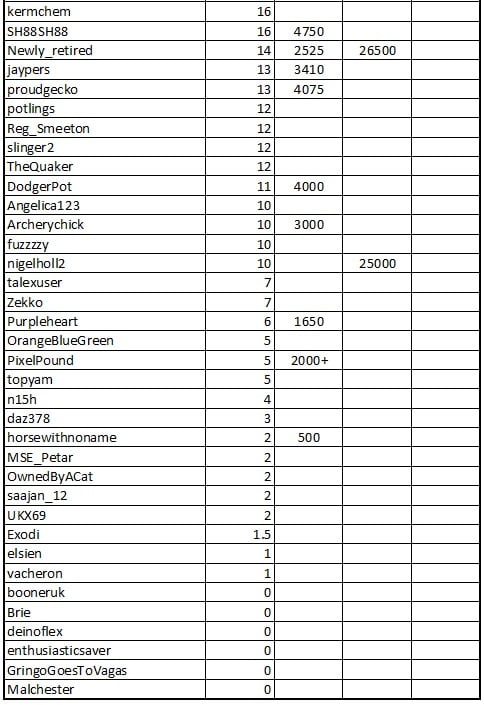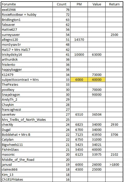 Bobblehat said:Kim_13 said:saverkev said:Bobblehat said:After Ch1ll1Phlakes experiment, I thought I'd see what the table would look like being generated directly from the spreadsheet (instead of coped from the forum) ....