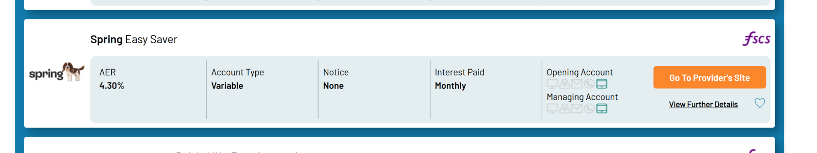 Nick9967 said:Hi all, strange one, a few days ago I chose Spring ( from Paragon Bank) to start a savings account , chosen based on rate (4.3% easy access) , access, and a good app, I got it from MSE , however just checking what else is out there and searching today I cannot find it anywhere, or indeed on other sites, any ideas? thanksnote that the rate drops from 4.30% to 4.11% on Friday 17th October (2 weeks today).it's still listed on the Moneyfacts site - I have the account, and like it - it's just at that new rate (even the current one tbh), there is little need for me to use it for any significant balance.0