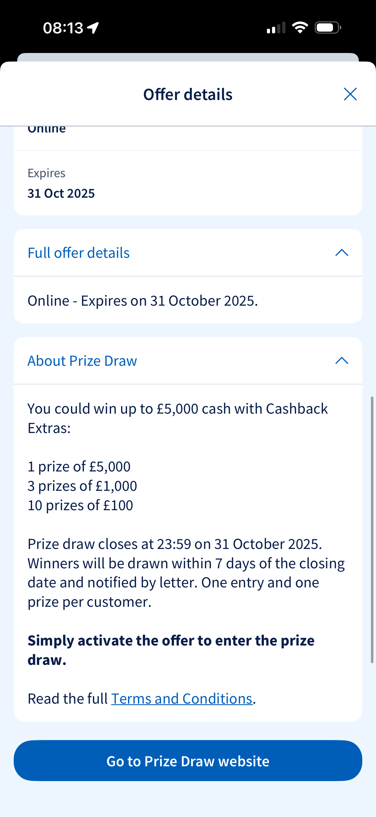 So that's clear then.That "Minimum spend £0.20" appears to be a default on all offers not requiring a higher spend. The prize draw offers says something like "just activate to take part".A similar draw is available from Halifax. So similar I did wonder if it's the same draw, but there's no mention of it being across multiple brands.However, as I don’t have a debit or credit card with Lloyds, I’m not surprised.0 -