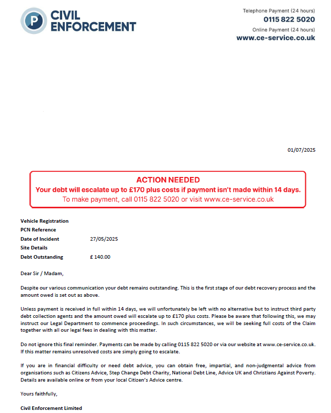Dear Civil Enforcement Ltd Data Protection Officer,