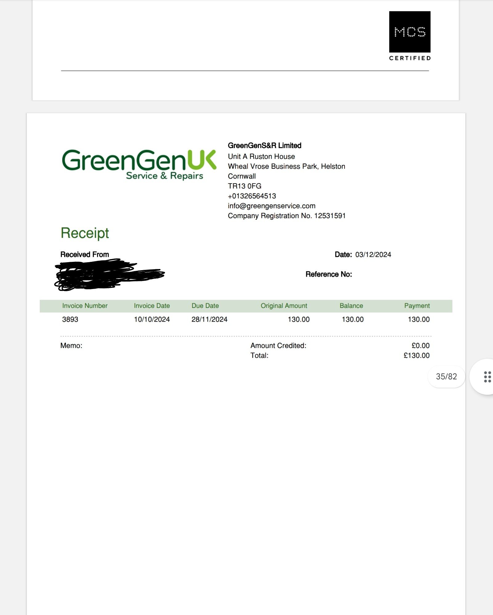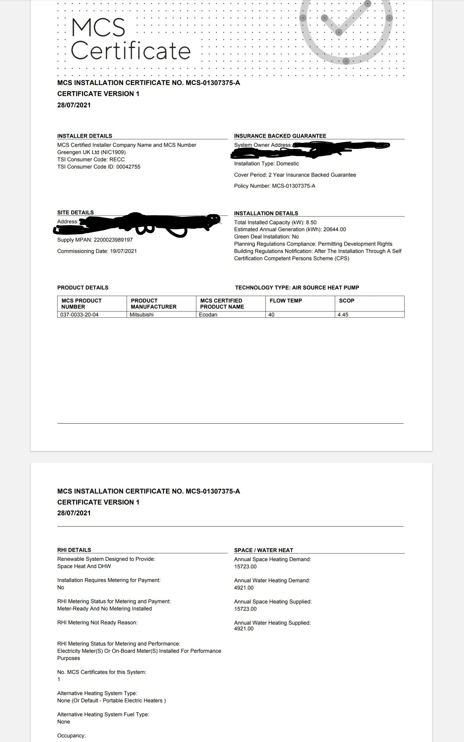 That's the MCS certificate for the heat pump (Mitsubishi Ecodan), which apparently has a SCOP of 4.45 and a design flow temp of 40C. If it actually achieves that, then that's a very good performance.The invoice for £130 may be for the annual service (guessing as it doesn't specify what it's for) - if it is, then it's on the cheaper side. I've seen service costs typically in the £180-250 range for a heat pump system depending if you are just having the heat pump serviced, or the whole system.As with any house purchase, I'd want to see the last 12 months bills to determine running costs.You also want to see the MCS certificate for the solar installation (and the DNO letter granting permission to connect to the grid), which is probably more important as you won't be able to get paid for solar export without it.Our green credentials: 12kW Samsung ASHP for heating, 7.2kWp Solar (South facing), Tesla Powerwall 3 (13.5kWh), Net exporter1