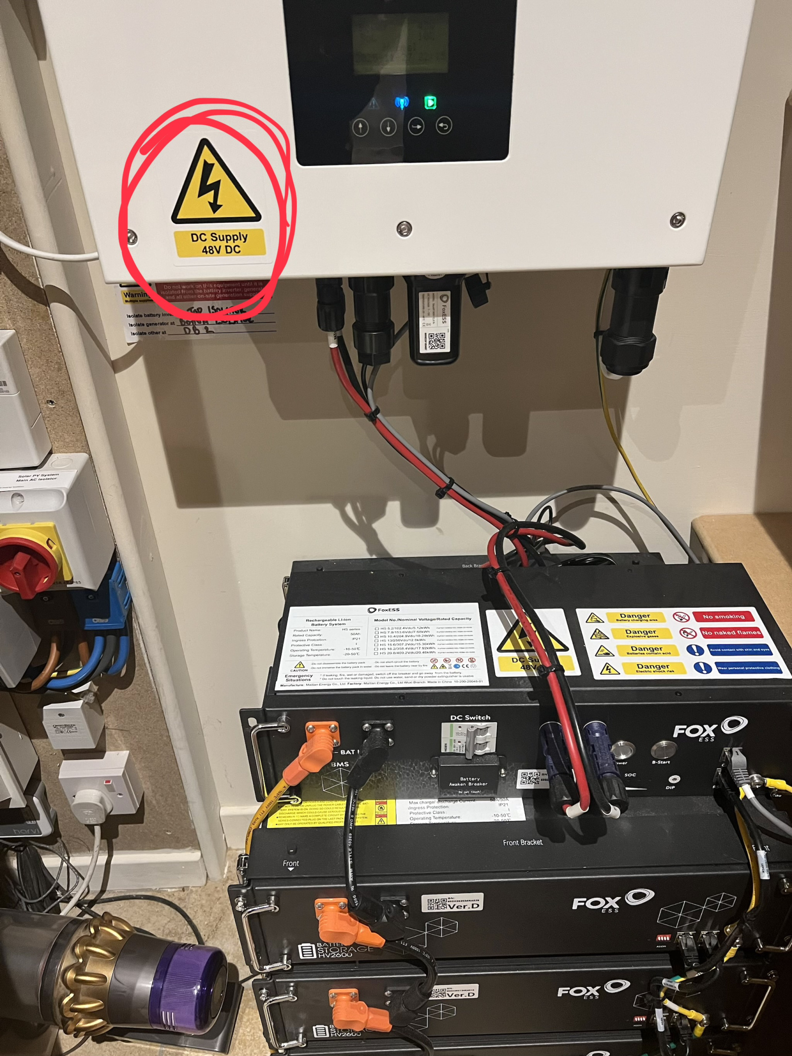 Those 48V stickers are misleading and (I'd suggest) dangerously wrong.If you look at the Fox battery modules (towards the bottom of your photo) you'll see that they are connected in series; the positive terminal of the top battery connects to the negative terminal of the one below. The individual battery modules might be "48 volts" (the datasheet suggests a 51.2V nominal voltage) but with four in series, the DC voltage at the terminals on your inverter will be over 200 volts - considerably more hazardous than 48 volts and deserving the same respect you'd give to mains electricity.Datasheet here:N. Hampshire, he/him. Octopus Intelligent Go elec & Tracker gas / Vodafone BB / iD mobile. Ripple Kirk Hill Coop member.Ofgem cap table, Ofgem cap explainer. Economy 7 cap explainer. Gas vs E7 vs peak elec heating costs, Best kettle!