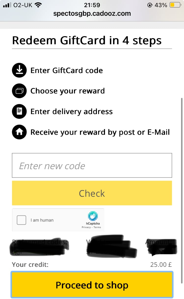 I have tried chasing this with both Spectos and Cadooz, but neither are responding.  This happened in September and I am getting to the point of accepting the loss, which would be a real shame - I don't think people can stomach that financial loss easily nowadays, anyway, I can't!