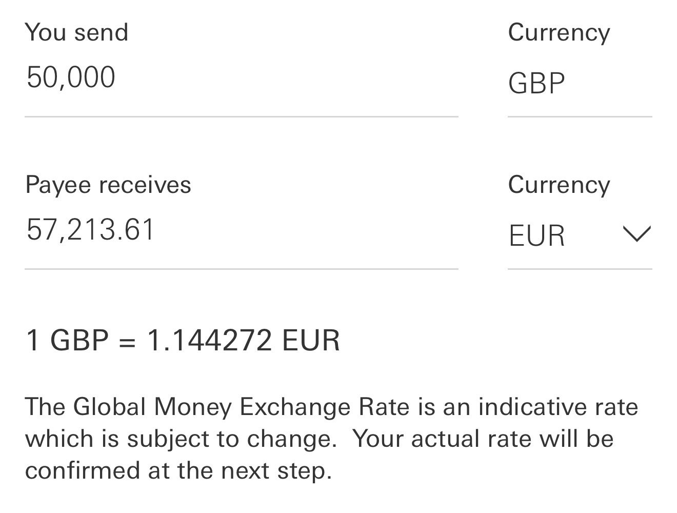 Checking Wise now, sending £50,000 would give the recipient €57,418.31 after £135.21 in fees. Worth just doing some other comparisons to see if you can beat it. Checking HSBC, you'd end up with €720 less. Wise isn't protected by the FSCS but they do safeguard your money in a separate account, so if your worry is that they go into administration, that money can't be touched.0