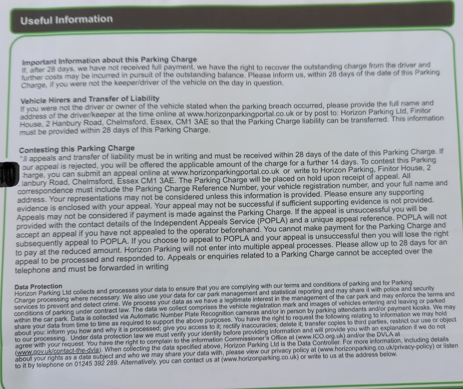 A family member has fallen foul of a Horizon Parking trap. It is in the process of being appealed but given recent forum threads about the scammer's parking notices not being POFA compliant could I ask forum regulars to cast an eye over the back of the notice and comment on whether it fails to comply or not Many thanks
