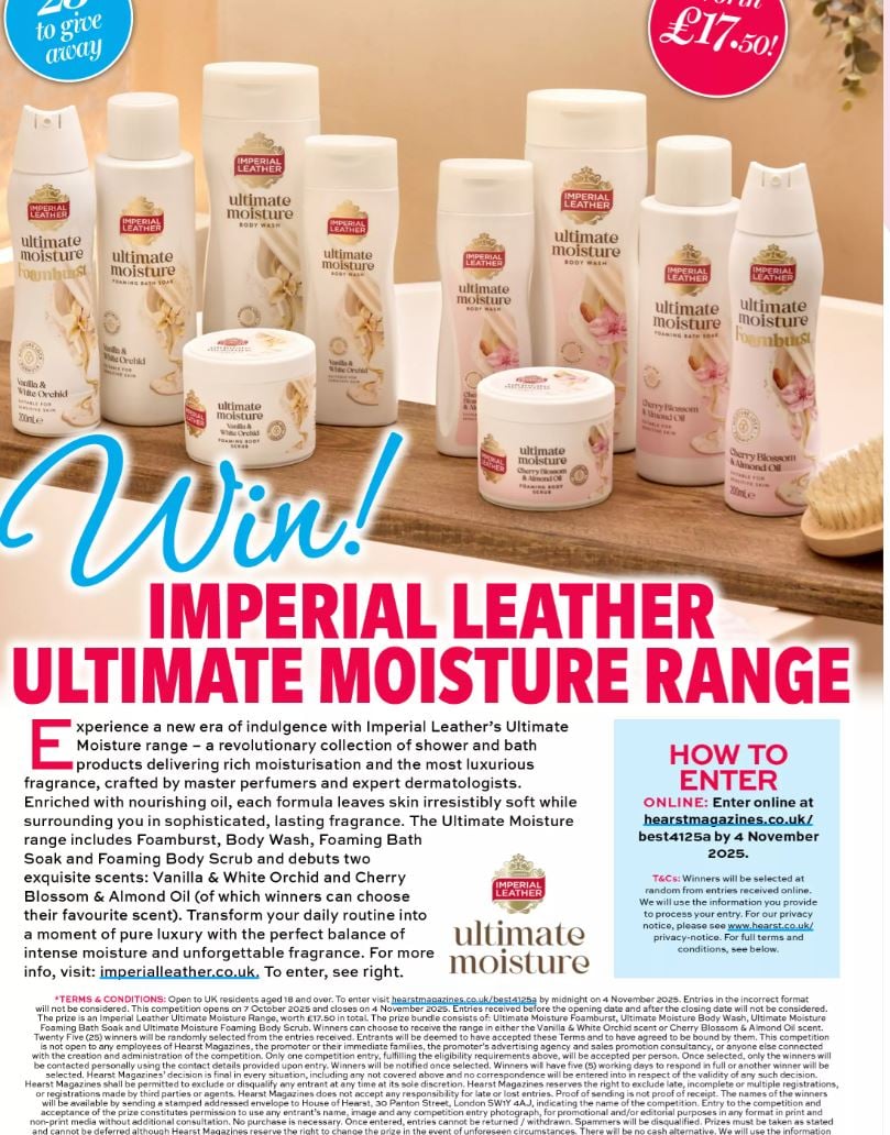 The prize is an Imperial Leather Ultimate Moisture Range, worth £17.50 in total. The prize bundle consists of: Ultimate Moisture Foamburst, Ultimate Moisture Body Wash, Ultimate Moisture Foaming Bath Soak and Ultimate Moisture Foaming Body Scrub. Winners can choose to receive the range in either the Vanilla & White Orchid scent or Cherry Blossom & Almond Oil scent. Twenty Five winners will be randomly selected from the entries received.