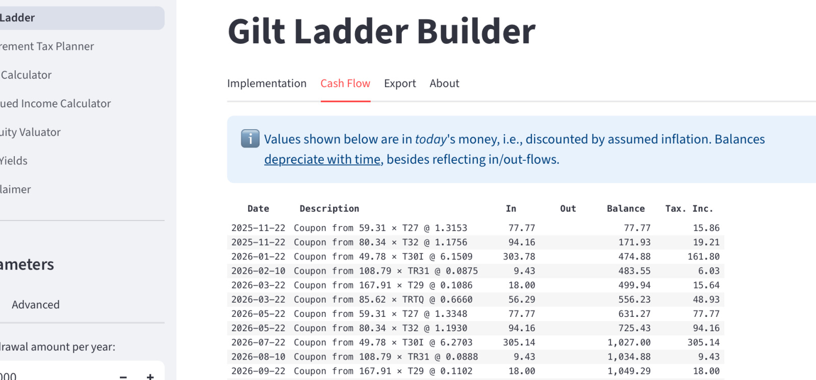 A note on that [excellent] tool. Note that the gilts selected in the table on the right change depending if you are going to pay tax on them with the tax slider on the left. If the gilts are in a SIPP/ISA (so set the tax slider to 0%) then you want higher coupon gilts because they will be tax free held in the SIPP/ISA. However, if the gilts are going to be held in a GIA - where coupons will be taxed - then you want low coupon gilts which will trade for less than the £100 price and you make your return on the Capital Gain - which is CGT free on gilts. It's really important to get your head around this if you are interested in investing in gilts.