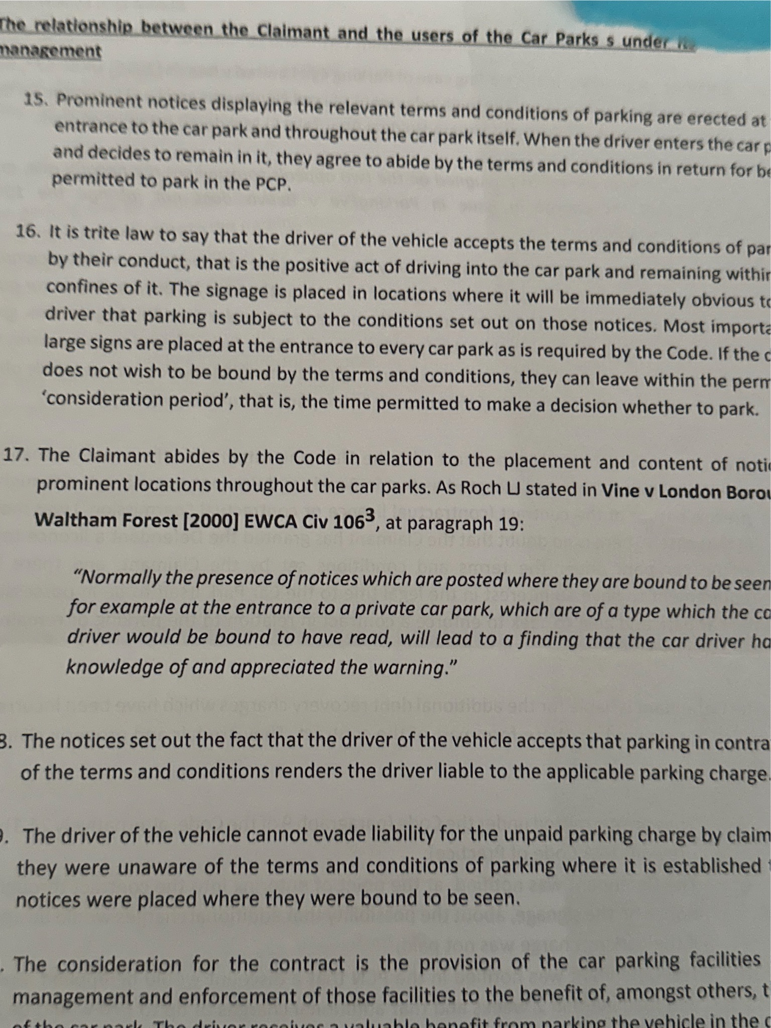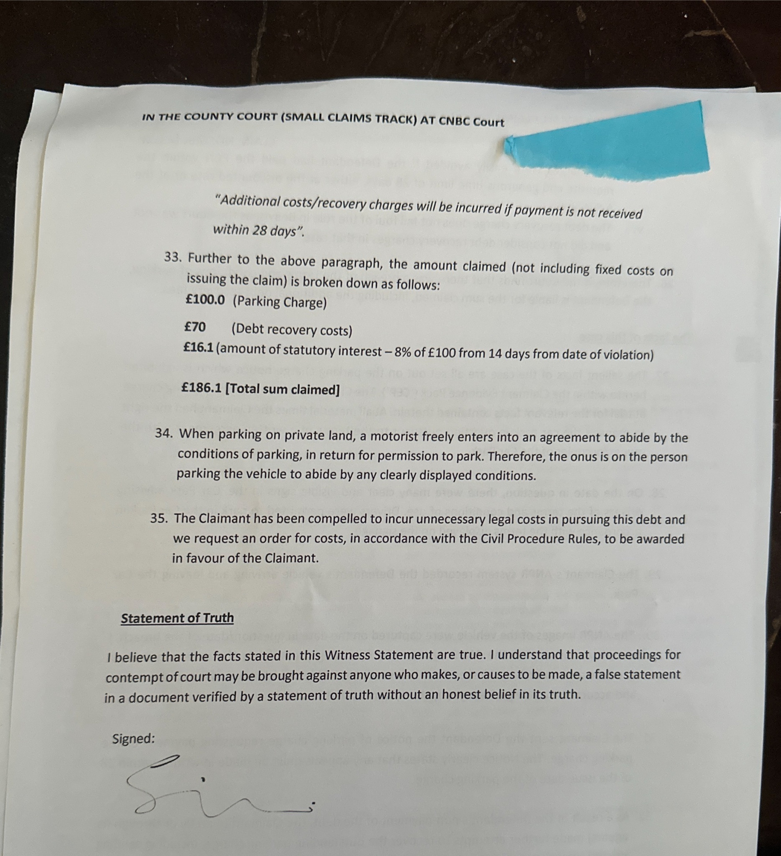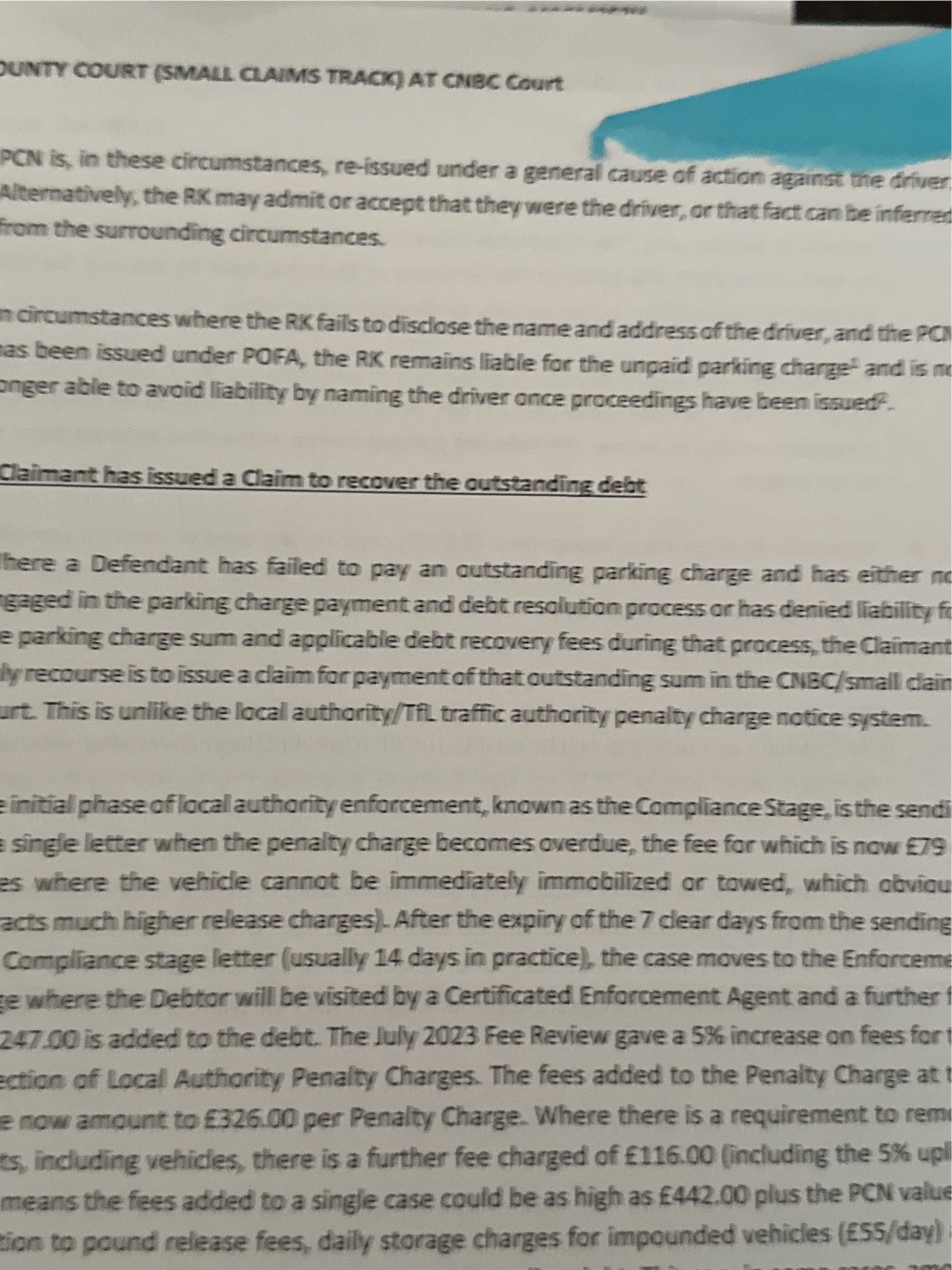 is the witness statement I received. It followed chaotic communication from CEL and DBCL. Don't know how background you need, here's a patchy summary. My other half drove my car, I am the registered keeper but we couldn't find a space, I was medically unable to drive at the time but I was a passenger. We didn't see that we'd gone into part of the car park belonging to a hotel chain not free parking of the neighbouring restaurant. Trouble is we did take around 20 - 30 mins to look then left without eating. All correspondence has been just wanting to pay up, then I got an email in Feb from DBCL saying their client was not pursuing the case - I've put this in court papers. To my surprise I got a court case and CCJ proceedings.. After completing the Directions Questionnaire I imagined next stages would be mediation and/or hearing date . Instead CEL are still on the case. The attached witness statement was received last week.