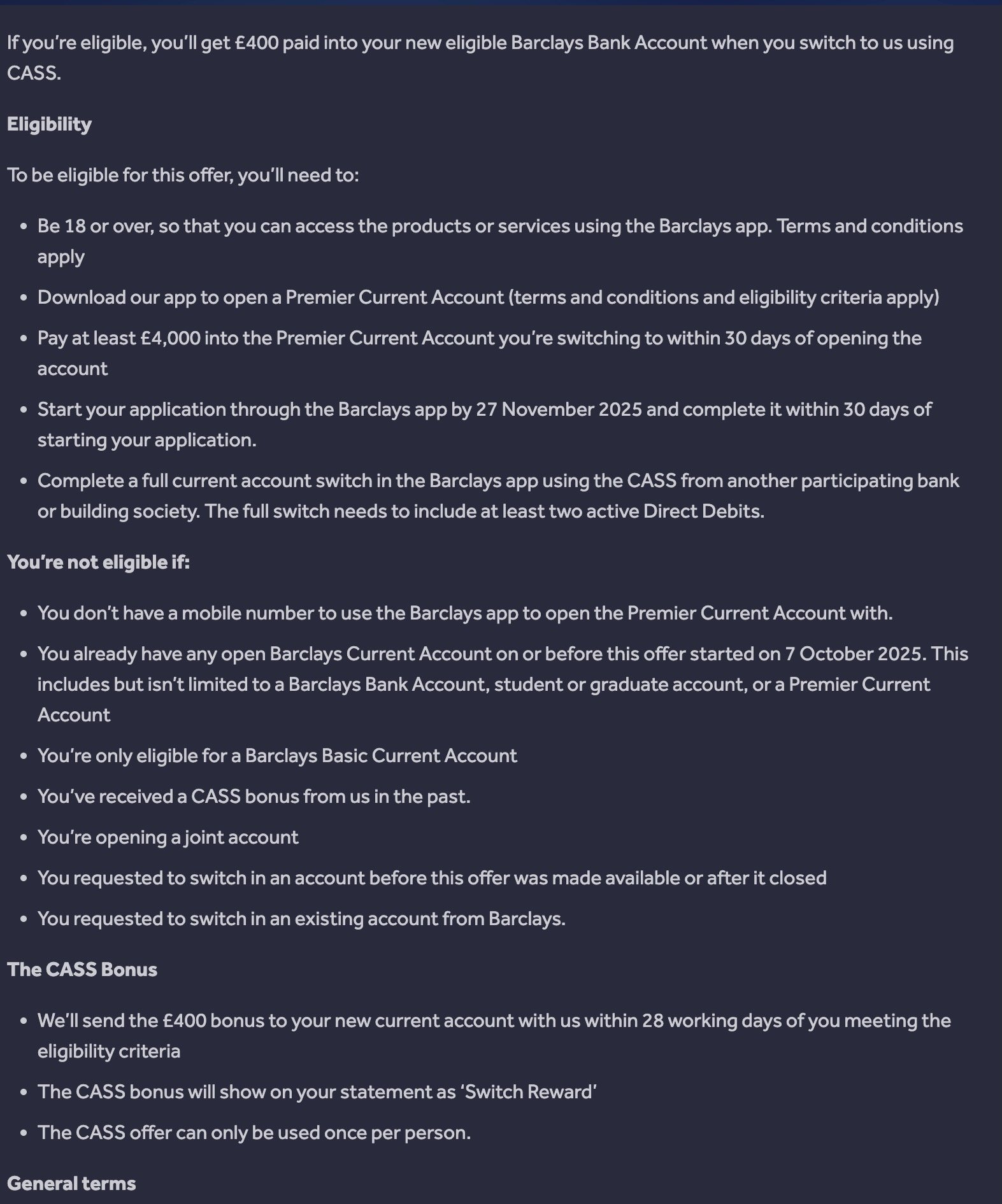 - You already have any open Barclays Current Account on or before this offer started on 7 October 2025. This includes but isn’t limited to a Barclays Bank Account, student or graduate account, or a Premier Current Account