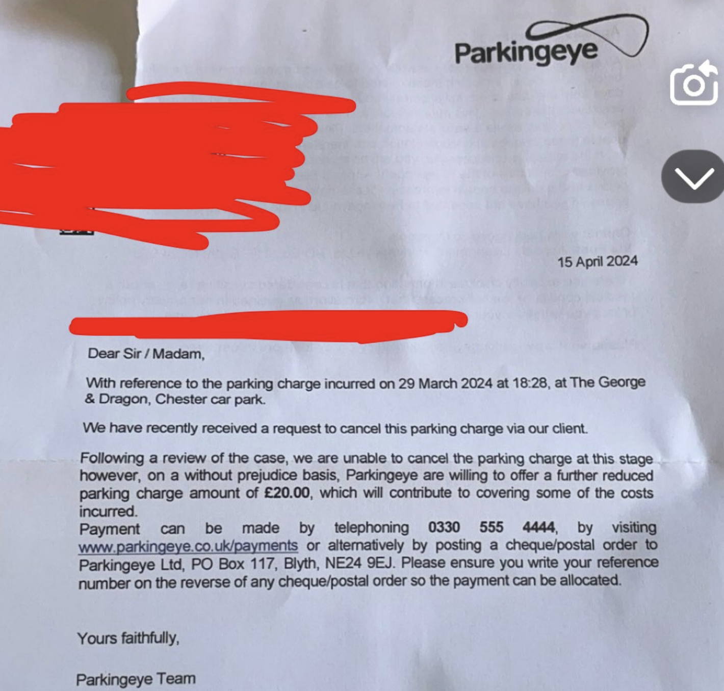 James_Poisson said:Hold on hold on!By this letter to you from Parking Eye they are admitting that their "client" i.e the person that engaged them on a free contract to manage parking, has asked them to cancel the charge (note they have not called it a penalty or fine please do not use that terminology) but they expect you to pay their admin fees.Ignore the greedy dimwits why should you pay their overstated postage fees you were there at the behest of the landowner or family member, why should you be out of pocket.Forget their without prejudice claim that is saying you can't use that in court to get their offer of £20 again, but they have admitted that the entity that engaged them told them to cancel, that is excellent evidence they are being unreasonable1