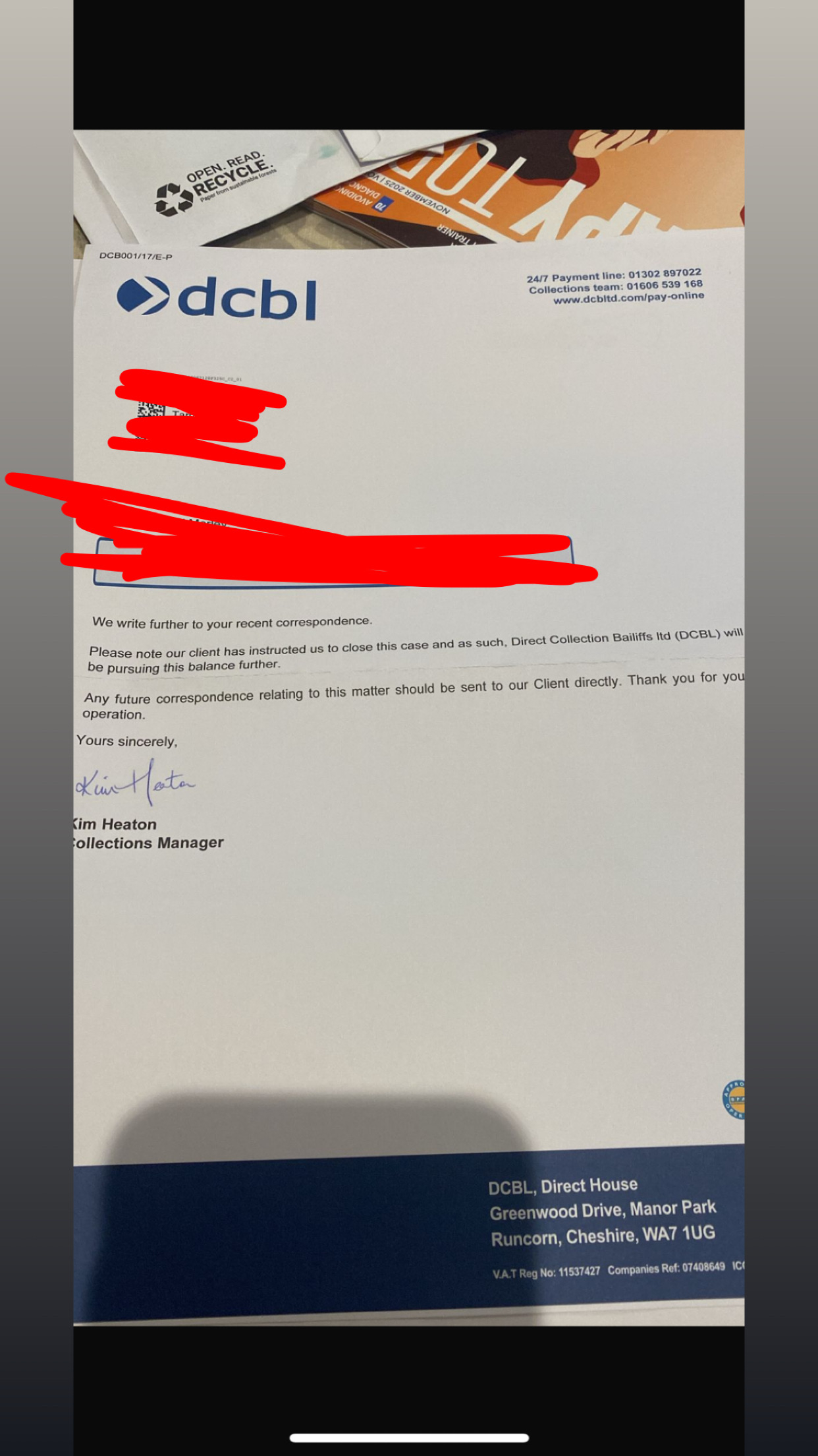 DCBL do this instead of telling you that they have transferred upstairs (or downstairs) to their sister company DCB Legal. It is a deliberate trick to mislead you into thinking the ordeal is over when DCB Legal are still pursuing the charge and will follow up with a Letter of Claim.Castle said: