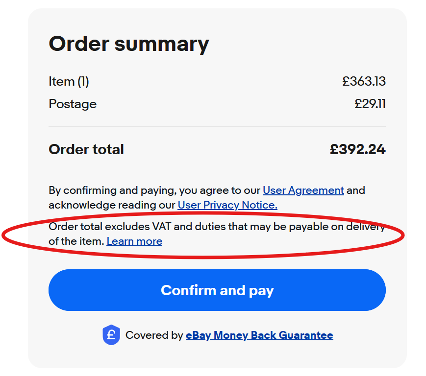 regency_man said:And for context, here is how one of their UK based, VAT included items (£375 free P&P) looks listed right next to a non-UK no-VAT included item (£363.13 + P&P)Checkout of the UK item:Checkout of the non-UK item:One tiny line of small print is all you get through the whole checkout process to hint that you might be paying £100s extra in taxes and duties. Not good enough IMHO.