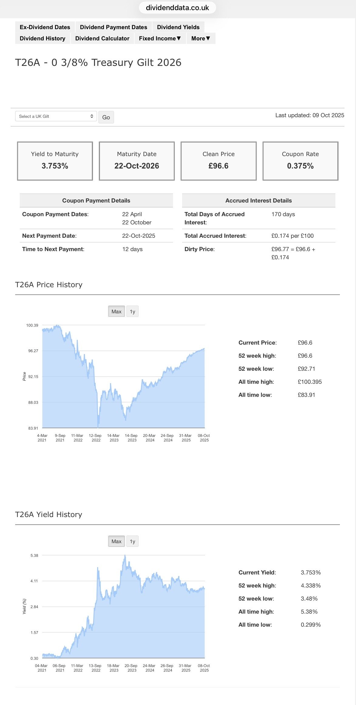 So I'd buy the £100 Gilt for £96.60 if I were to buy it today and I'd get back £100 upon maturity making me £3.40 profit which would be free from CGT (good to hold in a GIA). 3.40/96.60 = 3.52%