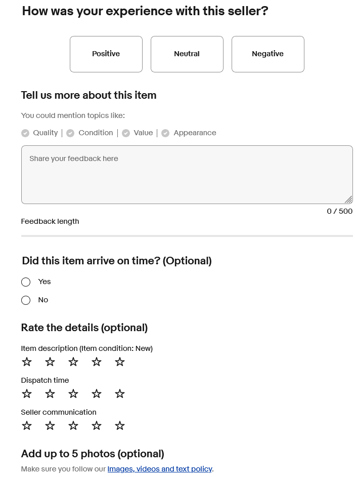PositiveNeutralNegativeYou need to wait 7 days before you can leave neutral or negative Feedback for this seller.