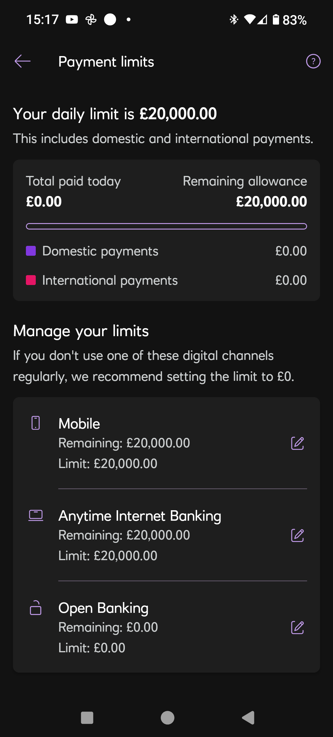 Once you have registered for biometrics in the app you can select your daily limit and the maximum is £20,000/day, not £750 to £2000.gunjin said:Be warned that they've got some pretty drastic withdrawal limitations on this account. £750 to £2000 max per day. If you are looking to dump a large sum into this be aware it could take you a long time to get it out of there! Does not look like there is a CHAPS option for larger amounts too (but I could be wrong on that).