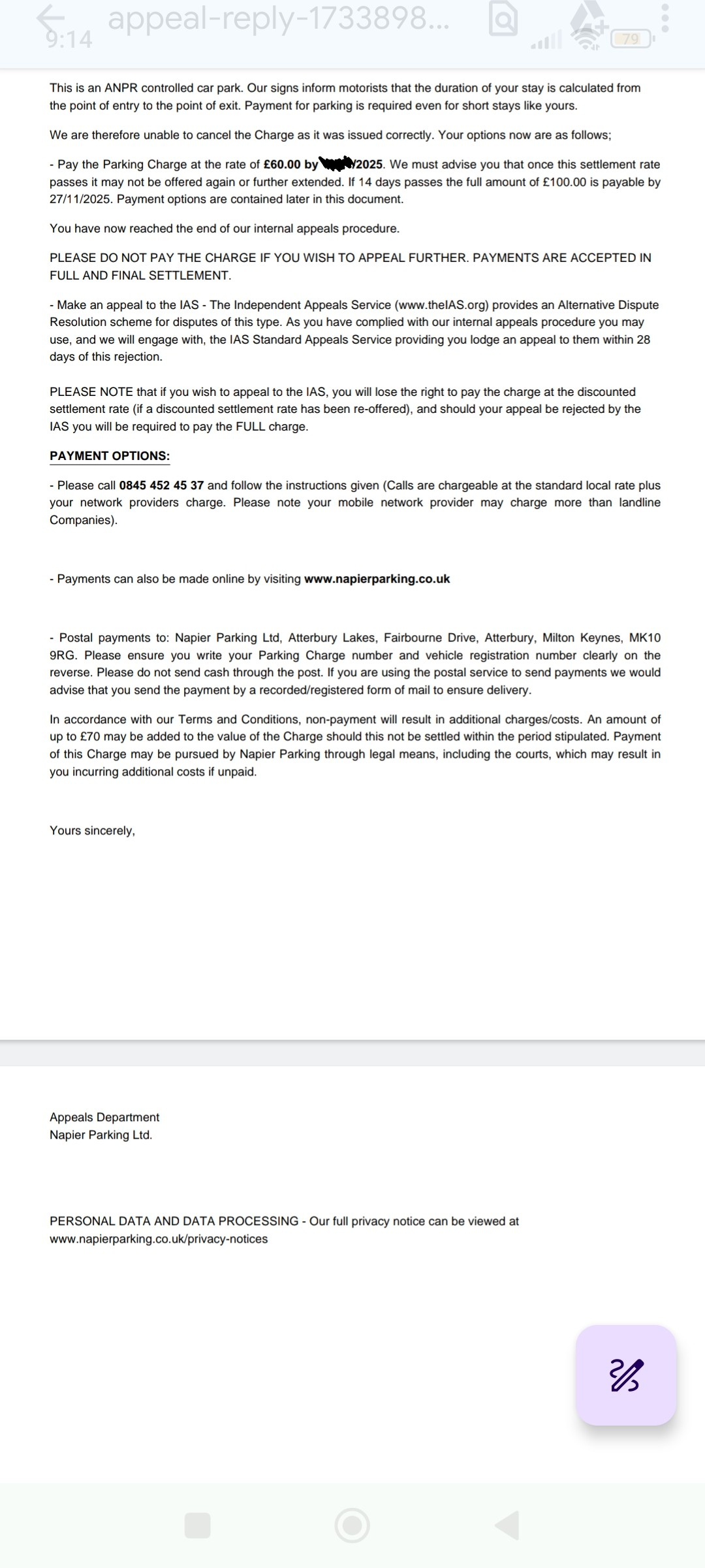 Your next steps are to pay (not advised) or ignore.Appealing with the IAS kangaroo court is futile.They won't tell you anything in their reply that helps you in any way, they only reply with things that they think will bully you in to paying them, that's all they exist for.It's private land what ever you say to them will be brushed off ANPR is their easy peasy catch em all cheap way of generating PCN's. They are measuring time on site and calling it parking that's their definition, yours or a judge's might be different.If you are getting photos of signage or better still lack of it, make sure the date stamp is turned on a photo on it's own could be from any time.4