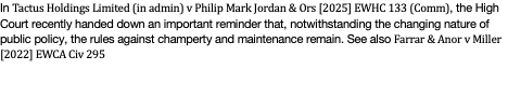 10. That is before even considering the doctrine of champerty in private parking cases, where some of these 'debt recovery' law firms are known to advertise that they 'front' court fees to fuel bulk litigation for commercial profit only when a sum is recovered. If this is the model used here - and the Claimant is put to strict proof to the contrary - paying £ hundreds of thousands in court fees per annum and maintaining boilerplate parking claims with no sign of client (or authorised solicitor) involvement in the cases litigated looks to be contrary to public policy, as well as in breach of DVLA KADOE rules where the parking operator must be the data controller throughout. The arrangement would be unenforceable as a result. In Tactus Holdings Limited (in admin) v Philip Mark Jordan & Ors [2025] EWHC 133 (Comm), the High Court recently handed down an important reminder that, notwithstanding the changing nature of public policy, the rules against champerty and maintenance remain. See also Farrar & Anor v Miller [2022] EWCA Civ 295