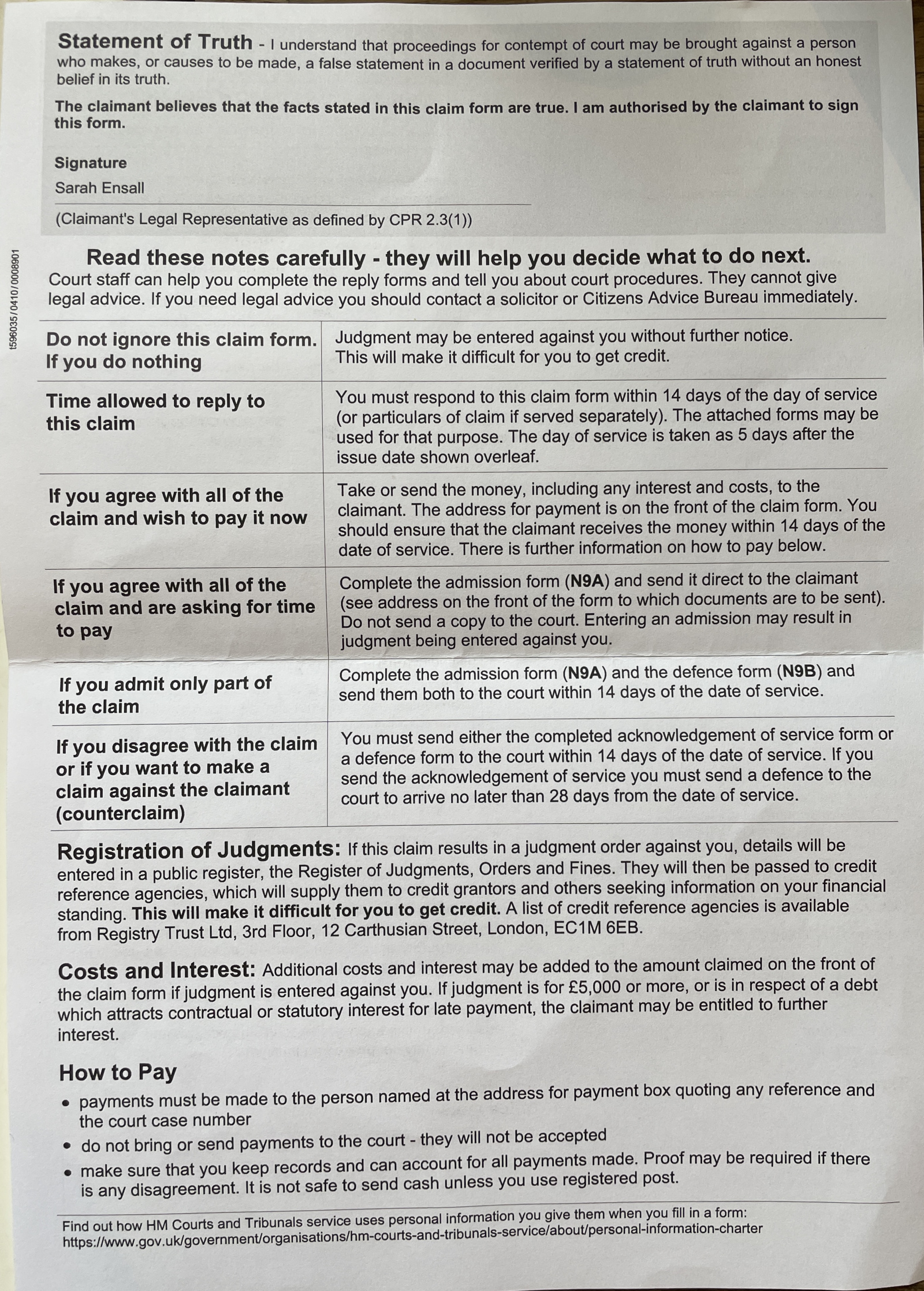 Who signed the Claim Form? Can we see the reverse page please?Please note, we are not a legal advice forum. I personally don't get involved in critiquing court case Defences/Witness Statements, so unable to help on that front. Please don't ask. .