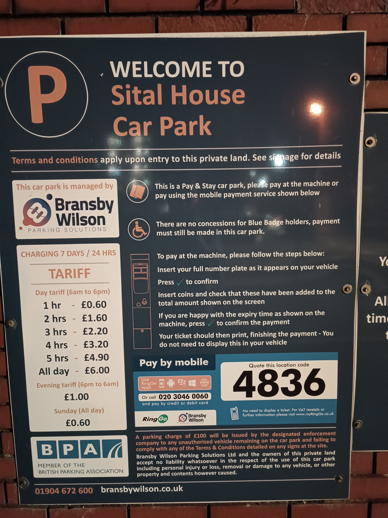 The story goes, I paid to park on a Sunday, the feeling is 60p for the whole day, I only stayed around 1hr30mins, when I paid I did so with cash at the machine.