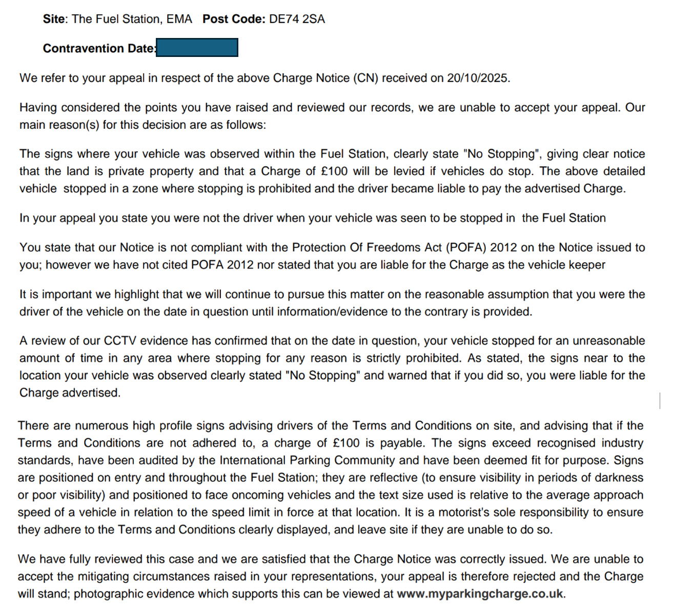 6. The NTK complies with POFA 2012. As registered keeper, we are holding the appellant liable for the Charge Notice under Schedule 4 of the Protection of Freedoms Act 2012, details of which where explained in the formal Notice sent on 09/10/2025. We note that the appellant has also declined to name the driver of their vehicle at the time of the incident in question. It is important that we make the adjudicator aware that we will rely on the keeper liability provisions within Schedule 4 of the Protection of Freedoms Act 2012 (PoFA) and as such, do not require those details.