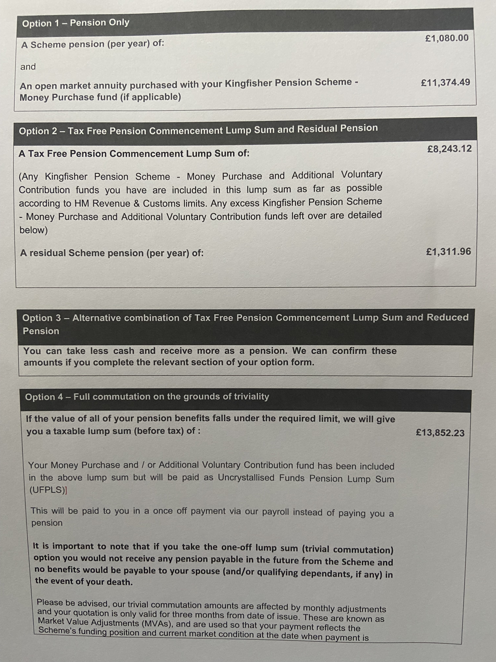 Hi, I have a tiny deferred pension with Kingfisher and have been provided with a quote with 4 options.