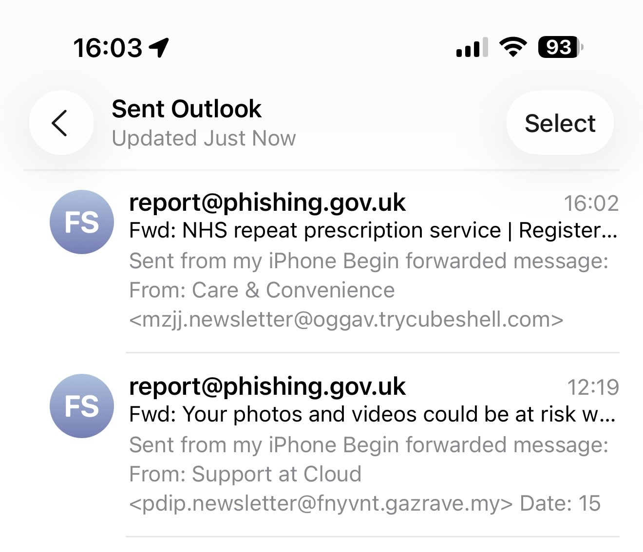 I mistyped the address in my first post! Here's a screen shot of an earlier email and my latest to the phishing line, both of which have been rejected.